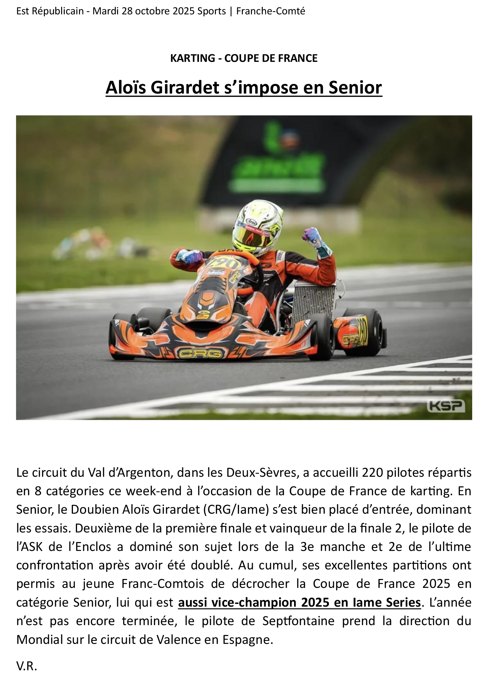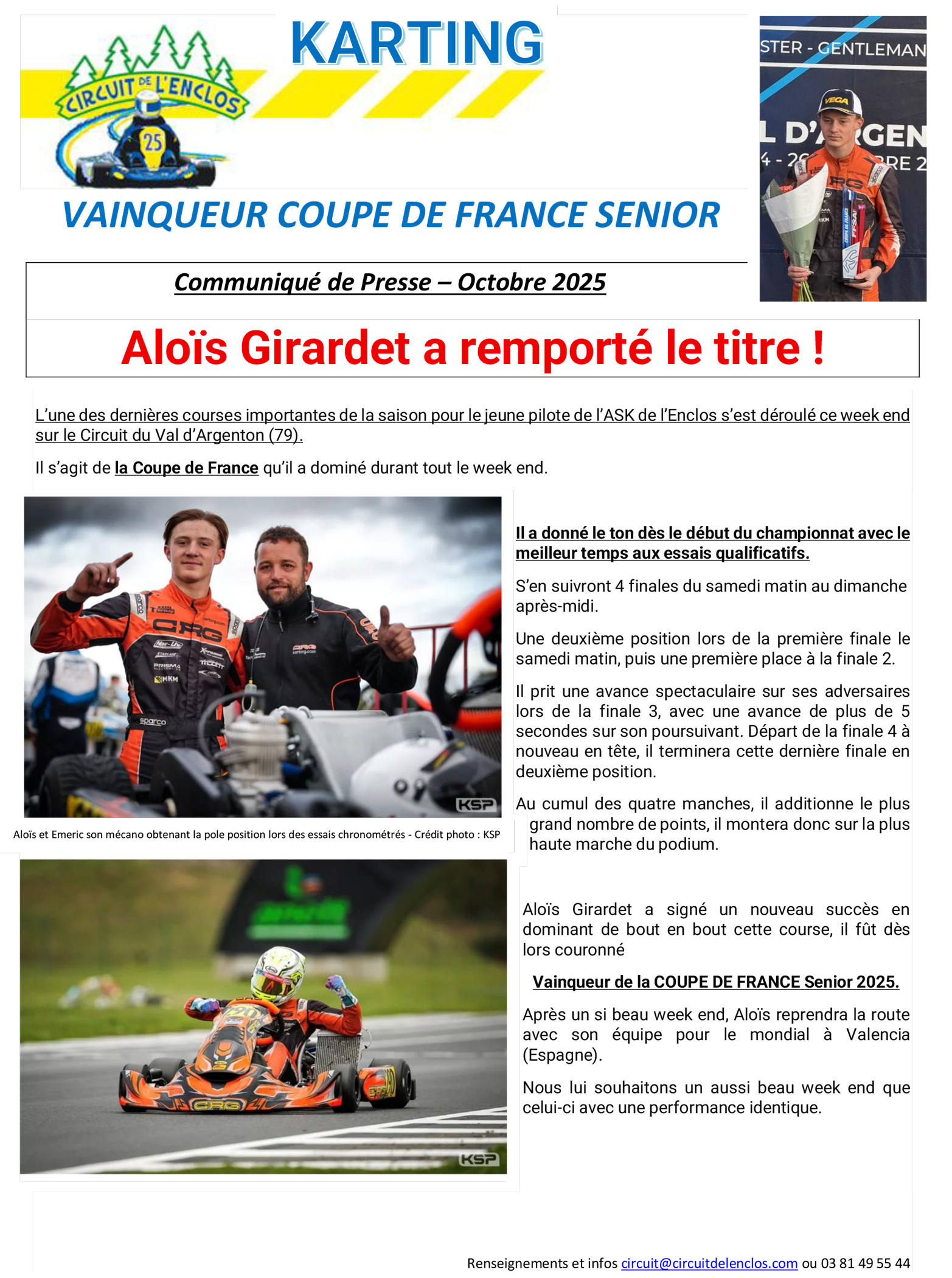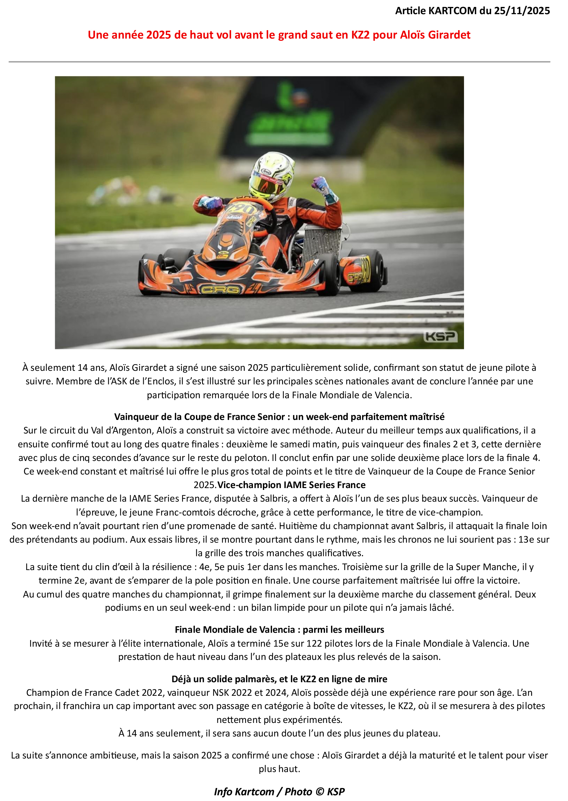 Palmarès d’Aloïs: 2022 (Cadet) : Champion de France, Champion NSK, 3e de la Coupe de France, Vainqueur du Trophée Kart Mag. 2023 (Nationale) : Champion de Ligue Bourgogne-Franche-Comté (BFC). 2024 (Nationale) : Champion NSK, 4e au Championnat de France, 5e à la Coupe de France.
